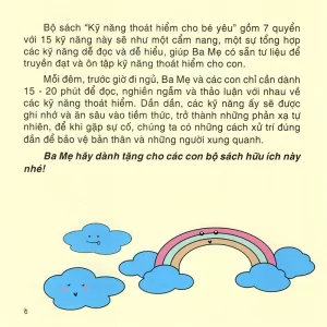 Bộ sách “Kỹ Năng Thoát Hiểm Cho Bé Yêu” gồm 7 quyển hướng dẫn 15 kỹ năng sẽ như một cẩm nang dễ đọc và dễ hiểu, giúp ba mẹ có sẵn tư liệu để truyền đạt và ôn tập kỹ năng thoát hiểm cho con.